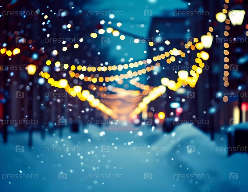Зима приносит мягкий снегопад на городские улицы, где разноцветные огни висят над головой, создавая теплую и праздничную атмосферу. Эффект боке от огней добавляет причудливый штрих, подчеркивая радость сезона