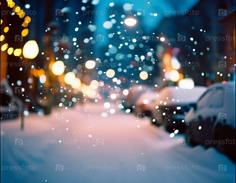 Зима приносит мягкий снегопад на городские улицы, где разноцветные огни висят над головой, создавая теплую и праздничную атмосферу. Эффект боке от огней добавляет причудливый штрих, подчеркивая радость сезона
