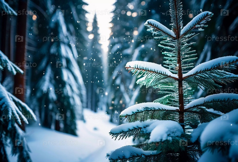 Безмятежный еловый лес, покрытый зимним снегом, демонстрирующий покрытые инеем деревья и мягкий снегопад, создающий спокойную атмосферу в мирной лесной обстановке. Генеративный ИИ