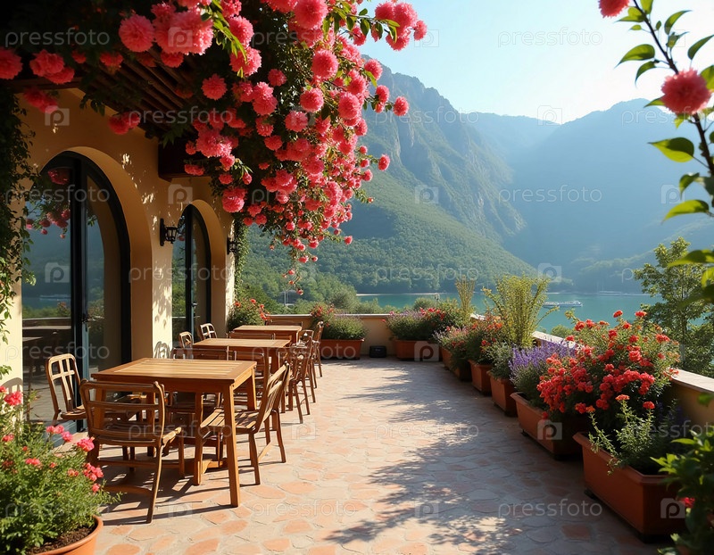 Солнечная терраса, окруженная яркими цветами, располагает к отдыху, предлагая захватывающий вид и уютное место со столиками и стульями. Терраса украшена цветущими цветами и живописными горами. Генеративный ИИ
