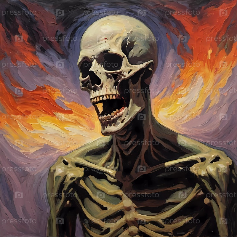 Пробуждение зловещего в темной, жуткой обстановке, демонстрирующей подробный и выразительный человеческий скелет, который вызывает чувство таинственности и предчувствия. Генеративный ИИ