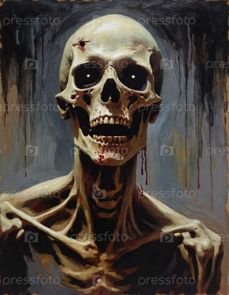 Пробуждение зловещего в темной, жуткой обстановке, демонстрирующей подробный и выразительный человеческий скелет, который вызывает чувство таинственности и предчувствия. Генеративный ИИ