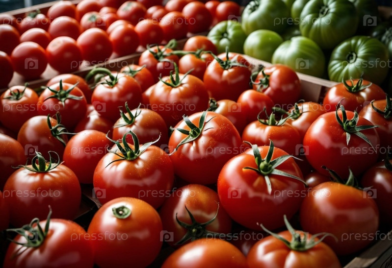 Супермаркет, полный красных томатов. Томаты сложены гроздьями. Свет отражается от поверхности томатов, подчеркивая яркий цвет и блестящую текстуру. Они были недавно собраны. Сгенерировано с помощью ИИ