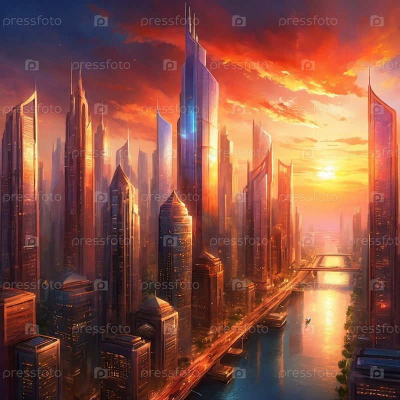 Захватывающий закат бросает теплый отблеск на возвышающиеся небоскребы в оживленном мегаполисе, создавая потрясающий контраст с красочным небом. Энергичная атмосфера городской жизни. Генеративный ИИ