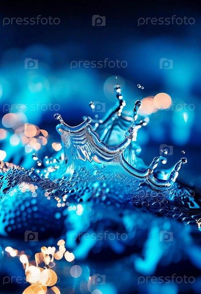 Яркие синие капли воды создают потрясающий всплеск, улавливая энергию и движение в ярком отображении цвета. Момент кажется живым и ярким, демонстрируя красоту природы. Замораживающее движение. Генеративный ИИ