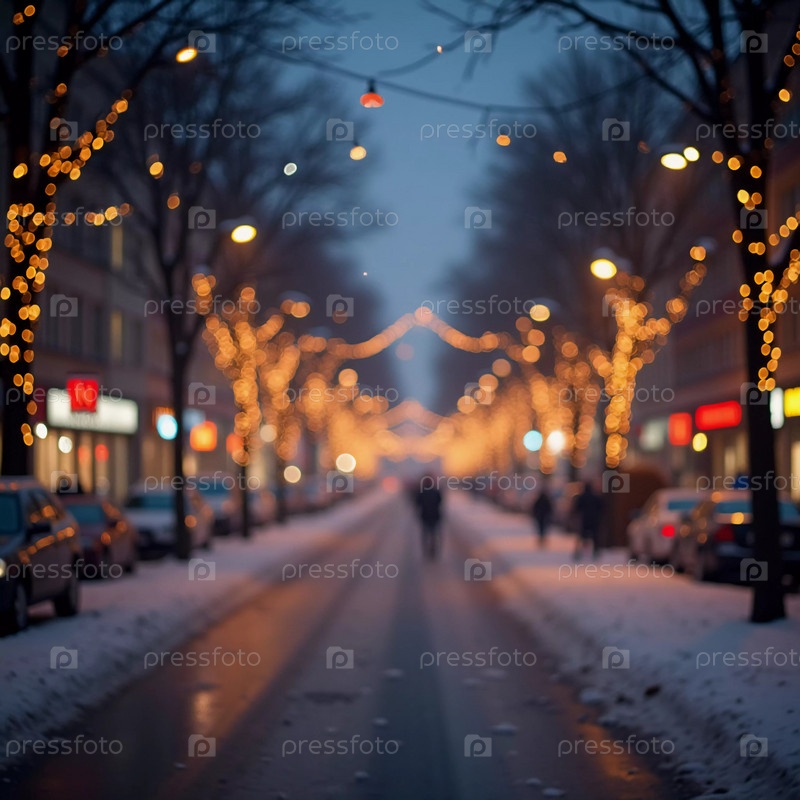 Тихий зимний вечер окутывает городскую улицу, где мягко падающий снег усиливает свечение рождественских огней. Праздничная атмосфера привлекает людей, празднующих Новый год. Генеративный ИИ