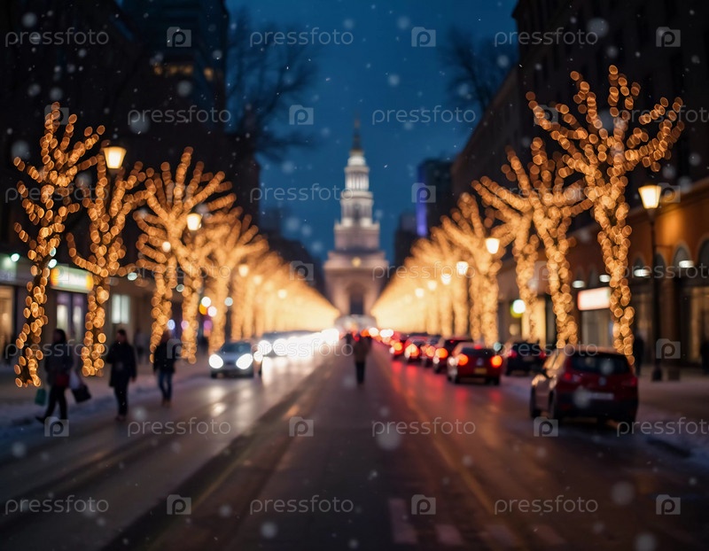 Тихий зимний вечер окутывает городскую улицу, где мягко падающий снег усиливает свечение рождественских огней. Праздничная атмосфера привлекает людей, празднующих Новый год. Генеративный ИИ