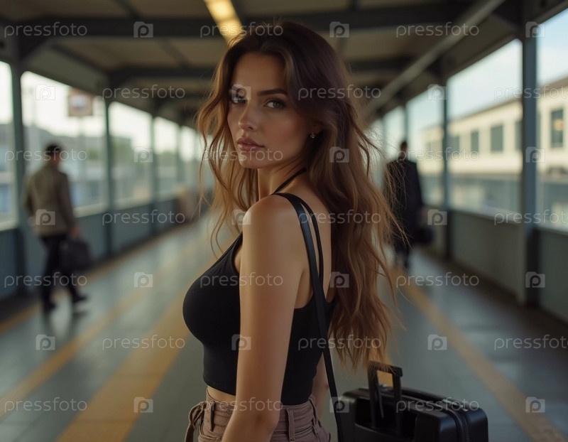 Девушка с волнистыми волосами стоит на вокзале, поворачиваясь, чтобы посмотреть в камеру, держа чемодан. Путешественники суетятся мимо нее, пока она ждет свой поезд. Красивая молодая женщина. Генеративный ИИ
