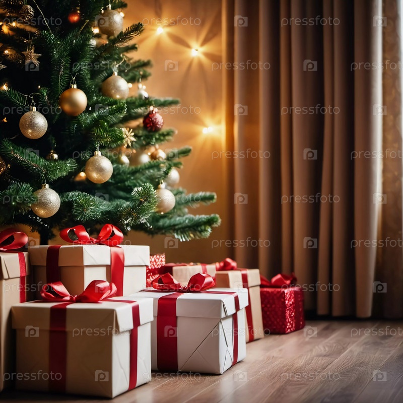 Упакованные в разноцветную упаковку подарки лежат под наряженной елью, украшенной сверкающими рождественскими игрушками, создавая веселую и праздничную атмосферу празднования Нового года