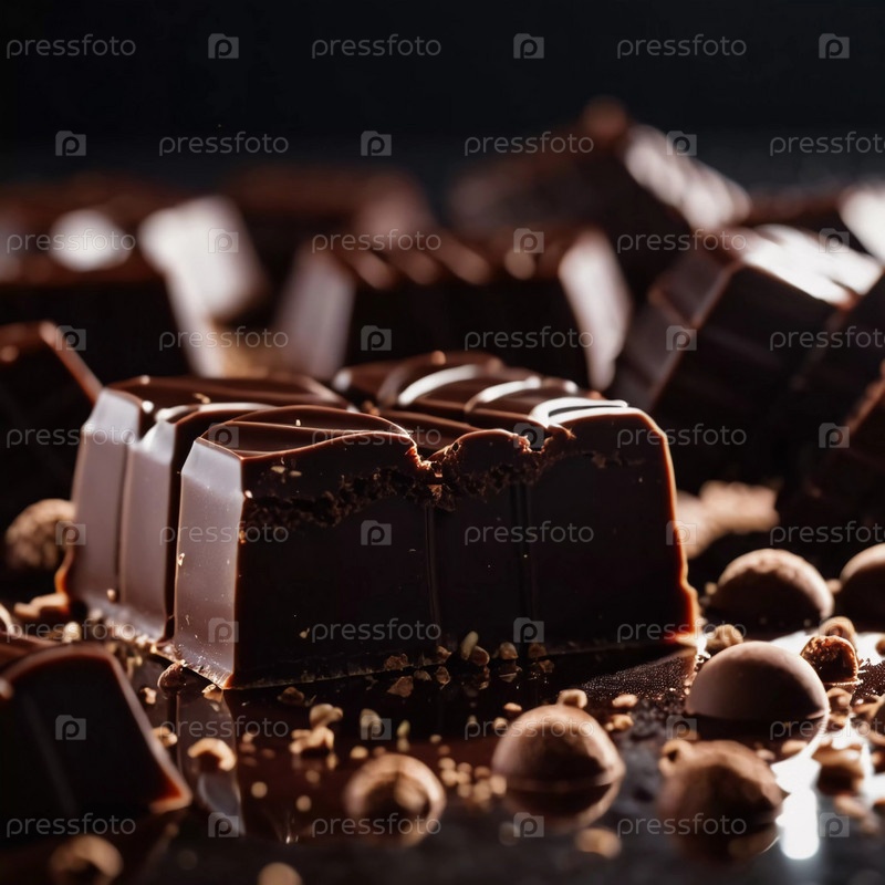 Ассорти из трюфелей из темного шоколада окружает квадрат из темного шоколада, все покоится на подложке из какао-порошка, что подчеркивает их роскошную текстуру и насыщенность. Генеративный искусственный интеллект