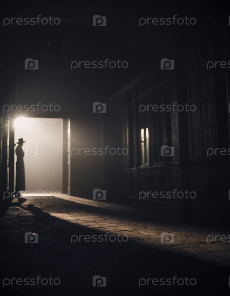 Впереди тянется темный коридор, освещенный слабым светом, который создает зловещие тени на деревянном полу, создавая леденящую атмосферу. Генеративный ИИ