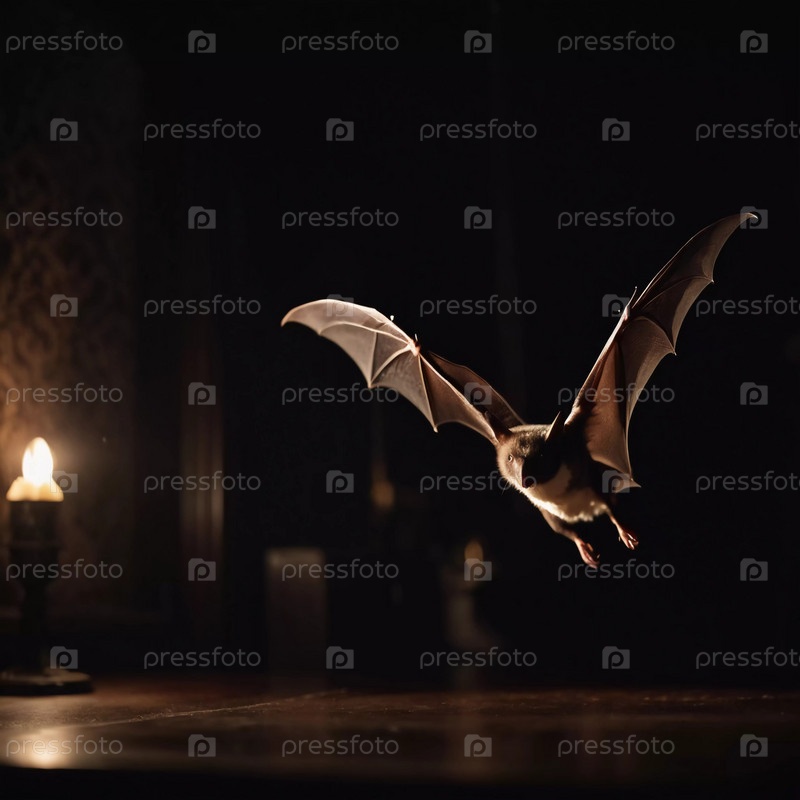 Летучая мышь, движется по темному коридору, наполненному теплым оранжевым светом. Атмосфера создает жуткую и напряженную атмосферу, усиливая таинственную атмосферу. Генеративный ИИ