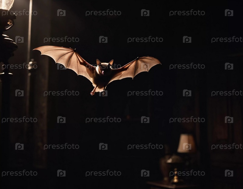 Летучая мышь, движется по темному коридору, наполненному теплым оранжевым светом. Атмосфера создает жуткую и напряженную атмосферу, усиливая таинственную атмосферу. Генеративный ИИ