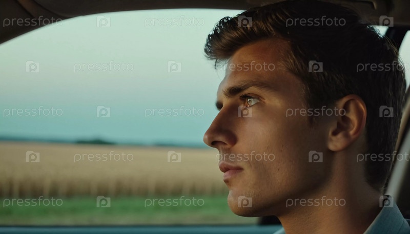 Молодой человек сидит на водительском сиденье, глядя в окно на обширное поле под тускнеющим сумеречным небом, погруженный в свои мысли во время поездки. Генеративный ИИ