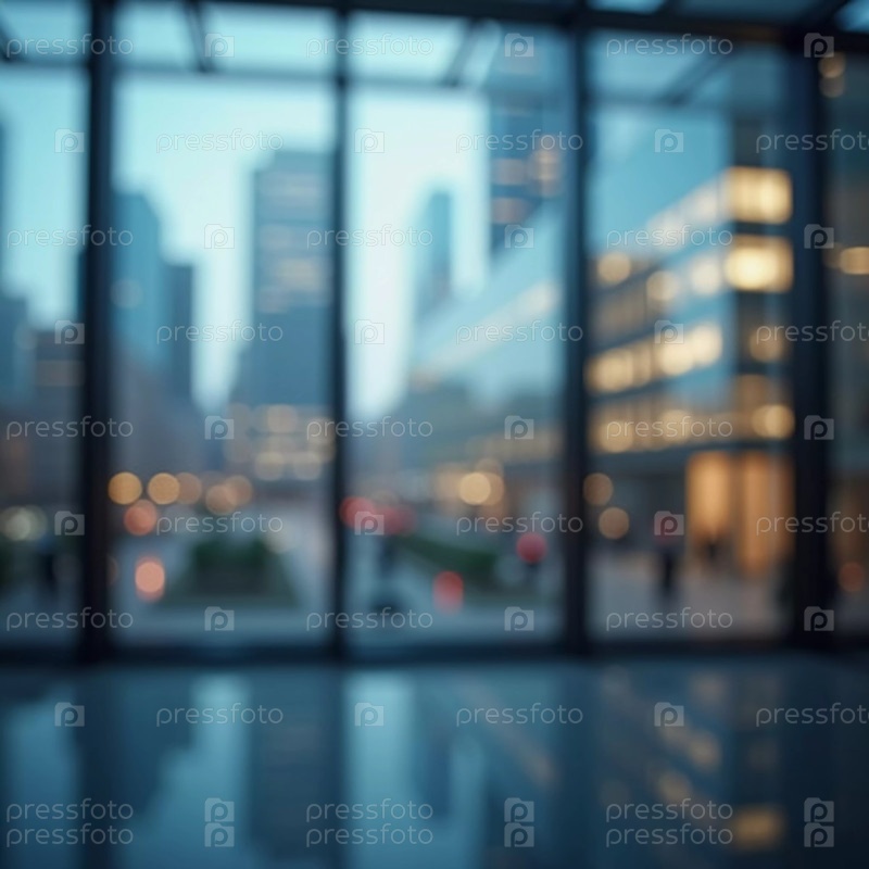 Размытая перспектива демонстрирует современный городской горизонт через стеклянную стену в сумерках, раскрывая яркость и сложность городской жизни. Угасающий свет отражает городскую энергию. Генеративный ИИ