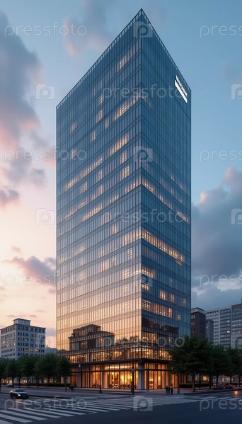 Высокое офисное здание с большими стеклянными окнами отражает яркие цвета заката.Городская обстановка и чистое небо создают спокойную атмосферу, когда день переходит в ночь