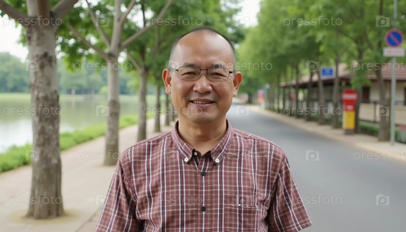 Житель Таиланда улыбается, стоя в парке. Пышные деревья выстилают тропинку у спокойного озера, а обстановка передает ощущение безмятежности. Генеративный ИИ
