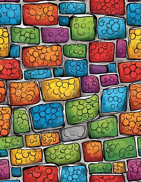 Эта яркая кирпичная стена демонстрирует множество цветов, включая красный, желтый, бирюзовый и фиолетовый. Дизайн отражает художественный подход, часто встречающийся в городской среде. Генеративный ИИ
