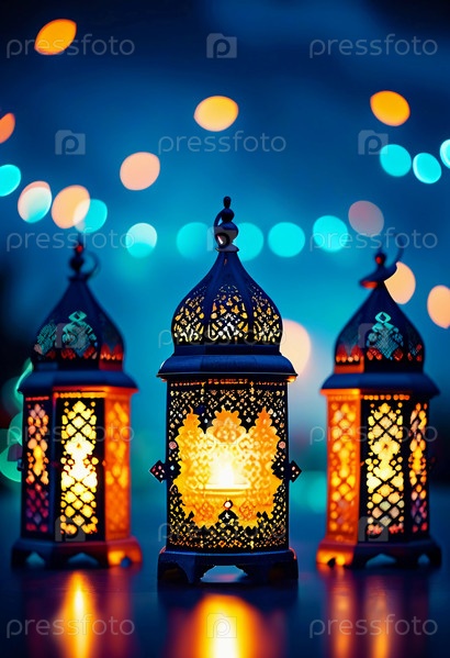 Яркие арабские фонарики ярко светят в праздничную ночь Рамадана, создавая теплую и уютную атмосферу для празднования и общественных собраний. Генеративный ИИ