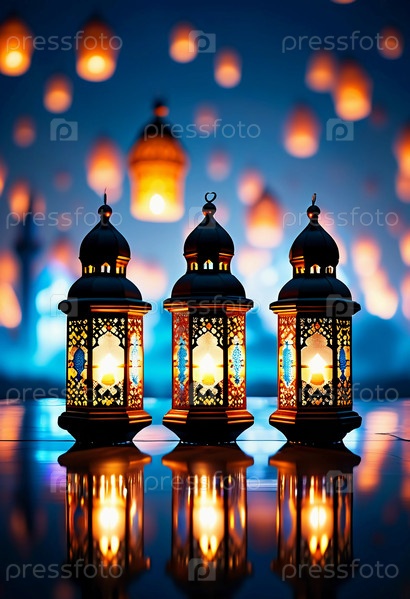 Яркие арабские фонарики ярко светят в праздничную ночь Рамадана, создавая теплую и уютную атмосферу для празднования и общественных собраний. Генеративный ИИ