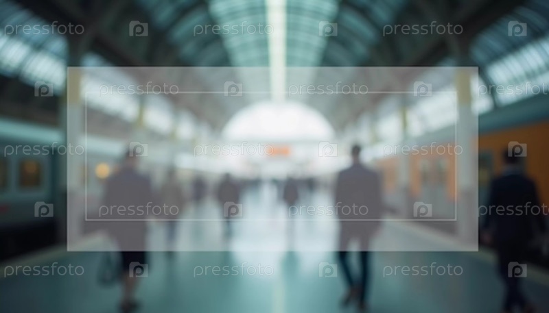 Пассажиры перемещаются по просторному вокзалу, окруженному полупрозрачным космическим фоном, ожидая свои поезда ярким утром, сливаясь с атмосферой. Генеративный ИИ