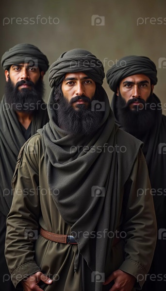 Группа вооруженных мужчин, одетых в традиционную одежду, стоит сплоченно, демонстрируя товарищество и готовность. Воинствующие мусульмане, похожие на Талибан или пакистанскую армию. Густая борода. Генеративный ИИ