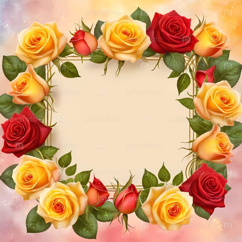 Розы в оттенках красного и желтого создают потрясающую границу вокруг пустого пространства. Этот дизайн предлагает прекрасный холст для сердечных заметок и особых сообщений. Генеративный ИИ