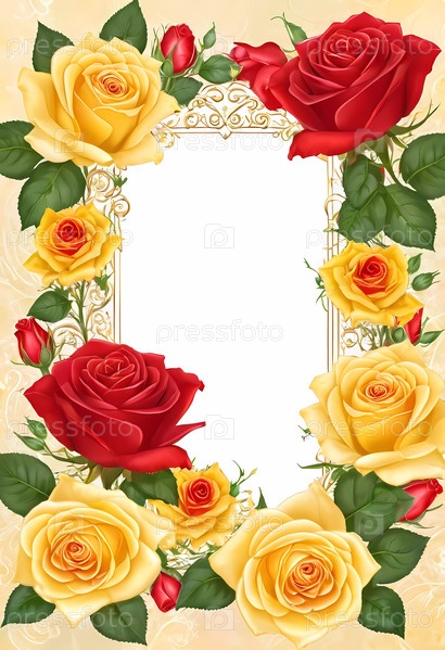 Розы в оттенках красного и желтого создают потрясающую границу вокруг пустого пространства. Этот дизайн предлагает прекрасный холст для сердечных заметок и особых сообщений. Генеративный ИИ