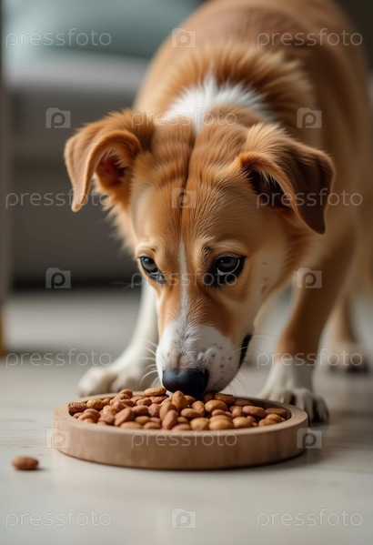 Живая собака с яркой шерстью и внимательными глазами жадно поглощает сухой корм из стильной деревянной миски, стоящей на светлом полу в теплой уютной комнате AI