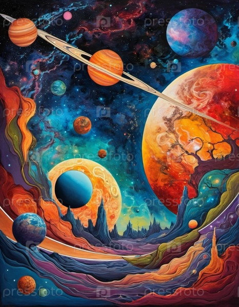 Планетарная система с несколькими планетами, большим ярко окрашенным газовым гигантом и каменистой планетой. Яркие звезды и огромное пространство темного космоса с галактикой на заднем плане. Космические просторы. Космонавтика. ИИ