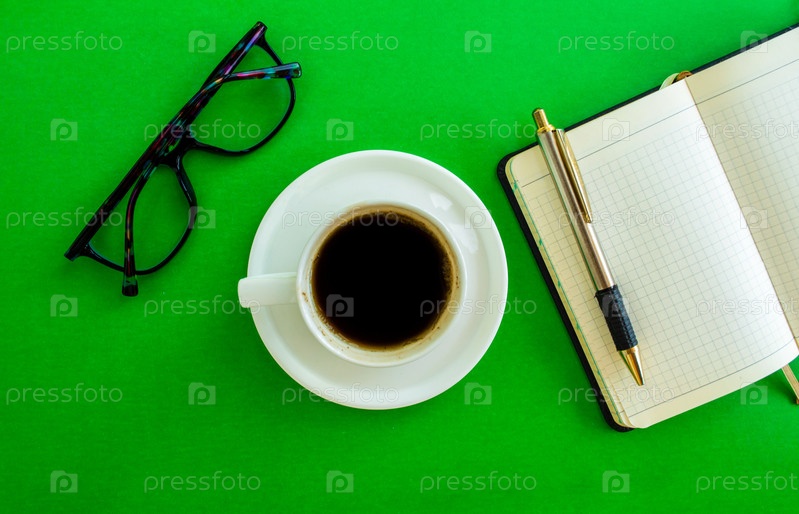 Рабочий стол. Очки, блокнот, ручка и чашка кофе на зеленом фоне