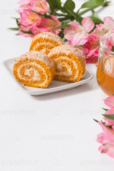 Праздничное сладкое угощение, богатое витаминами и клетчаткой, рулет из моркови и тыквы на белом фоне с местом для текста