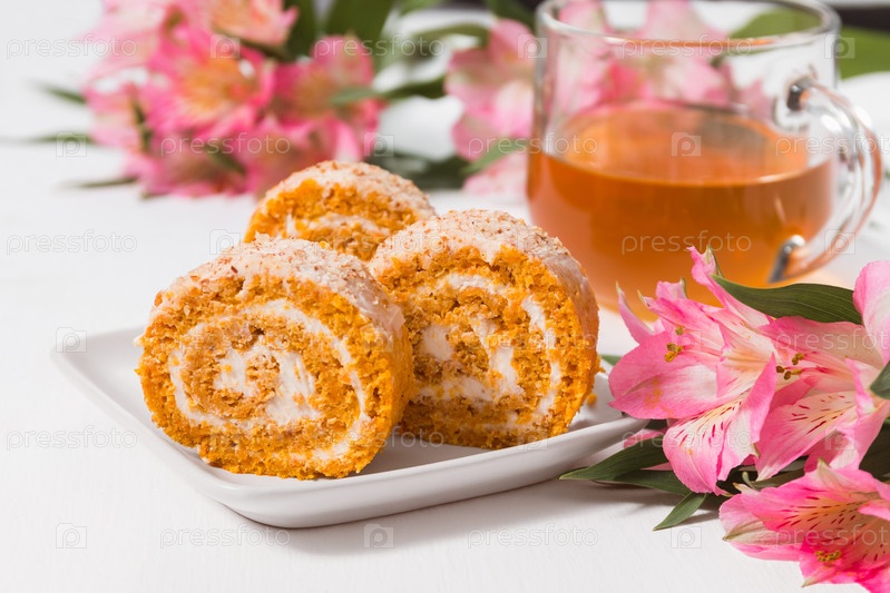 Рулет из тыквы и моркови с кремовой начинкой, с чашкой зеленого чая и букетом розовых альстромерий