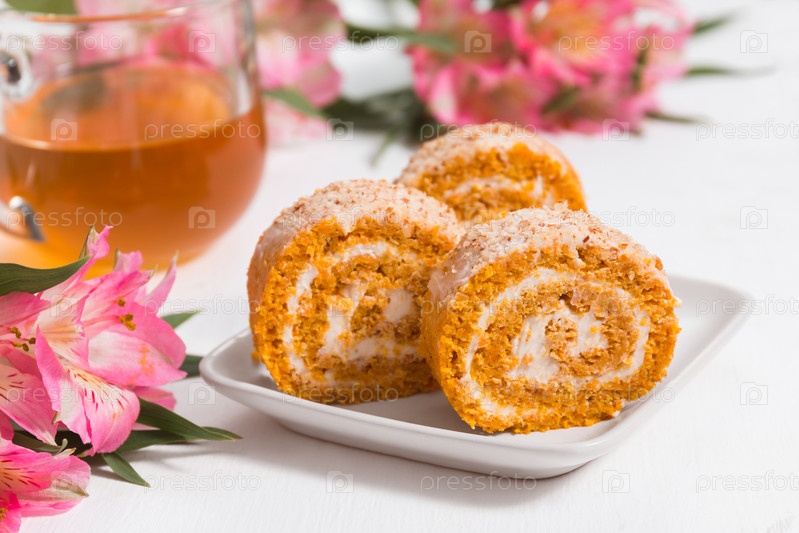 Нежный рулет из тыквы и моркови с кремовой начинкой, розовыми альстромериями и чаем на белом фоне крупным планом