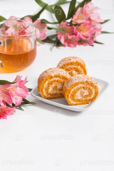 Тыквенно-морковный рулет с кремовой начинкой на белом фоне в качестве сладости для чаепития с местом для текста