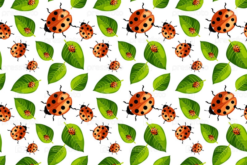 Яркий бесшовный узор с божьими коровками и листьями, создающий живой природный дизайн для различных художественных целей