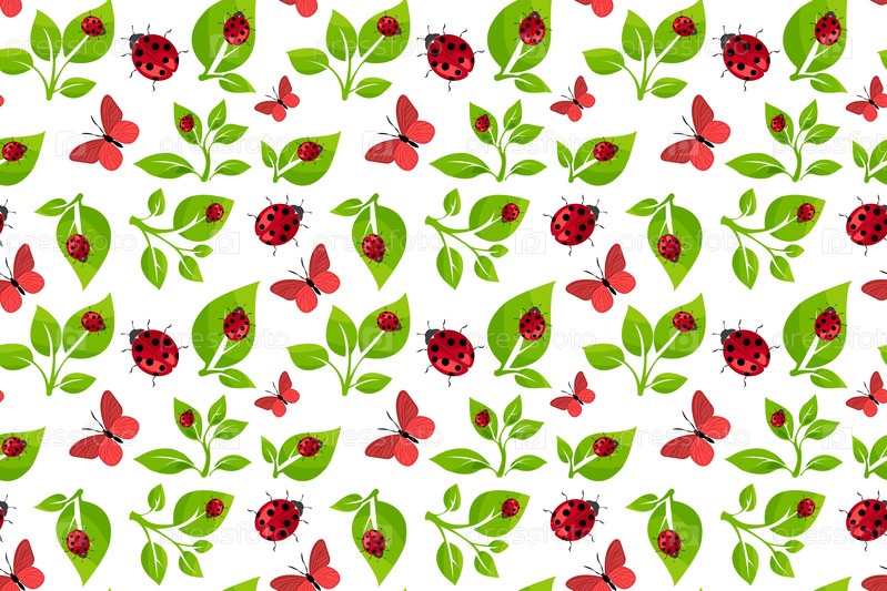 Красочный бесшовный узор с божьими коровками и бабочками среди зеленых листьев, подходящий для различных творческих проектов