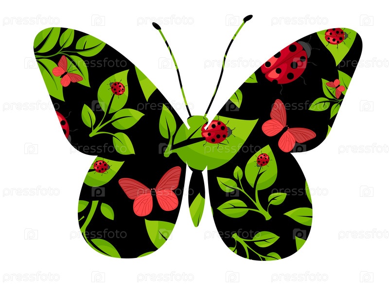 Красочная иллюстрация бабочки с яркими божьими коровками и пышными листьями на темном фоне