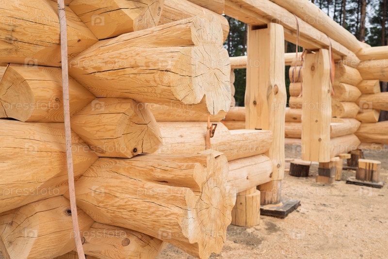 Строительная площадка деревянного дома. Традиционный бревенчатый дом, построенный из бревен в солнечный летний день. Дизайн коттеджа