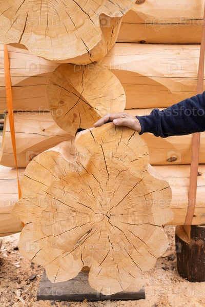 Строительная площадка деревянного дома. Традиционный бревенчатый дом, построенный из бревен в солнечный летний день. Дизайн коттеджа
