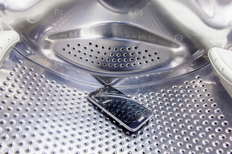 Сотовый телефон с разбитым дисплеем, выпавший из кармана одежды, лежит внутри барабана стиральной машины