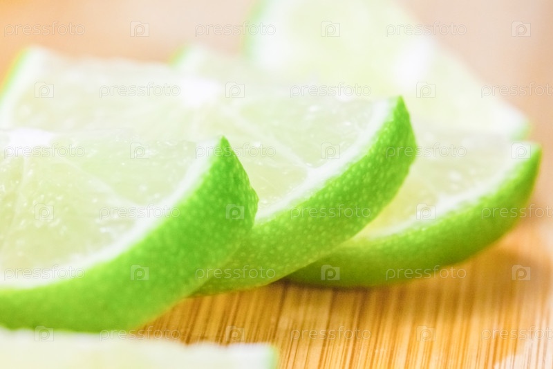 Ломтики лайма на деревянном столе, крупный план размытого фона