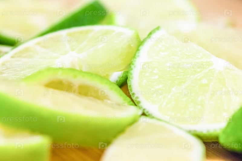 Ломтики лайма на деревянном столе, крупный план размытого фона