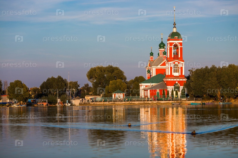 Золотое кольцо России, город Переславль-Залесский. Церковь Сорока Севастийских мучеников отражается на закате в Плещеевом озере