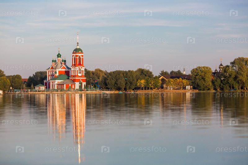 Золотое кольцо России, город Переславль-Залесский. Церковь Сорока Севастийских мучеников отражается на закате в Плещеевом озере