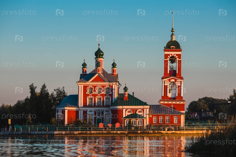 Золотое кольцо России, город Переславль-Залесский. Церковь Сорока мучеников Севастийских на красивом розовом закате на берегу Плещеева озера