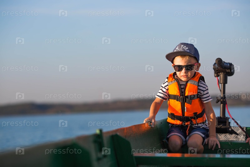 Красивый, модный 5-летний мальчик в ярком спасательном жилете и солнцезащитных очках катается на моторной лодке по озеру на закате. Отдых и туризм