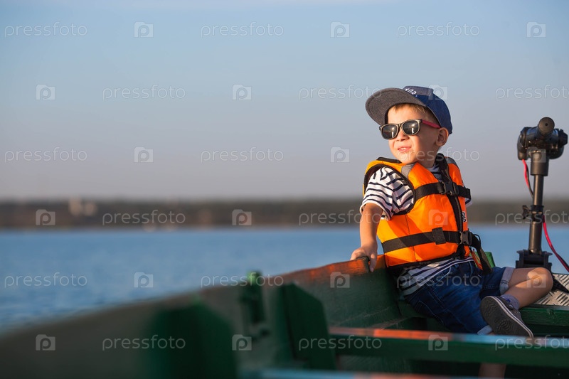 Красивый, модный 5-летний мальчик в ярком спасательном жилете и солнцезащитных очках катается на моторной лодке по озеру на закате. Отдых и туризм