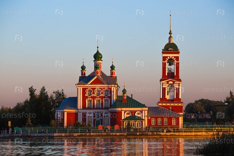 Золотое кольцо России, город Переславль-Залесский. Церковь Сорока мучеников Севастийских на красивом розовом закате на берегу Плещеева озера