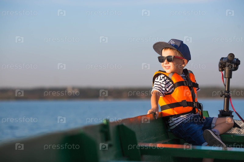 Красивый, модный 5-летний мальчик в ярком спасательном жилете и солнцезащитных очках катается на моторной лодке по озеру на закате. Отдых и туризм